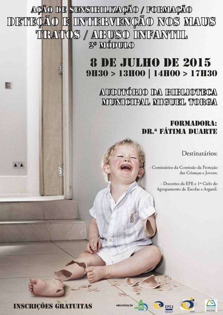 No âmbito do Plano de Anual da CPCJ de Arganil – Ação n.º VIII “Autoscopia Técnica”, decorrerá no próximo dia 8 de Julho, a partir das 9h30, no Auditório da Biblioteca Municipal Miguel Torga, o 2º Módulo da Ação de Sensibilização/Formação – Deteção e Intervenção nos Maus Tratos / Abuso Infantil, ministrada pela Dra. Maria de Fátima Duarte, membro da Comissão Nacional de Proteção de Crianças e Jovens em Risco (CNPCJR).