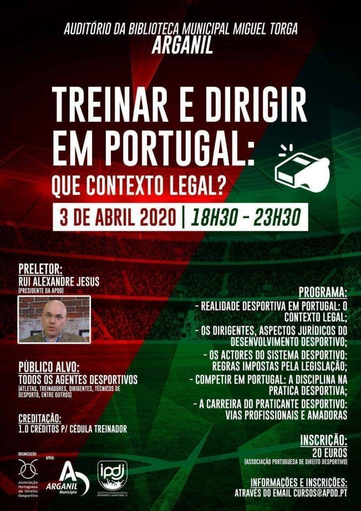 A Associação Portuguesa de Direito Desportivo, com o apoio do Município de Arganil, realiza no dia 3 de Abril, entre as 18h30 e as 23h30, no Auditório da Biblioteca Municipal Miguel Torga – Arganil, a ação de formação “Treinar e dirigir em Portugal: contexto legal”.