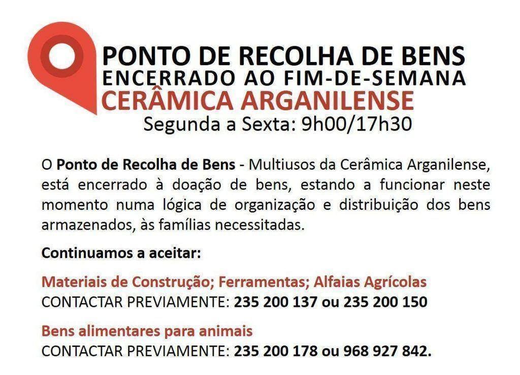 Desde a sua abertura que o Centro de Recolha de Bens de apoio às vítimas dos incêndios, a funcionar na Cerâmica Arganilense, tem recebido, vindo um pouco de todos os pontos do país e mesmo do estrangeiro, alimentos, vestuário, água, artigos de higiene, entre outros bens necessários a quem, infelizmente, quase tudo perdeu nos incêndios de outubro.