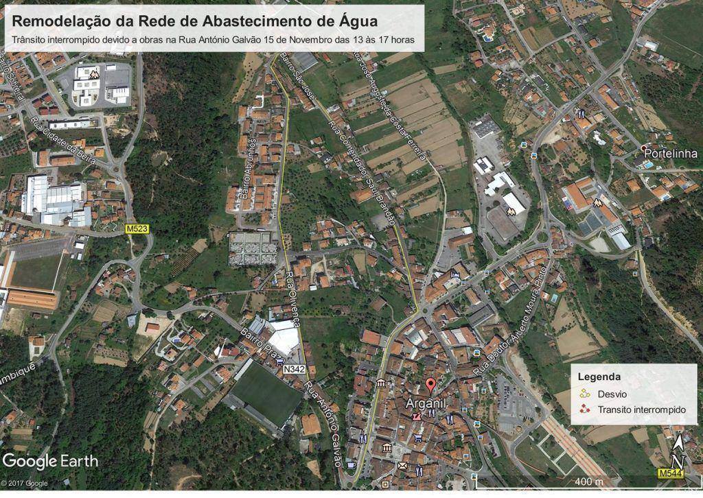No seguimento dos trabalhos de Remodelação da Rede de Abastecimento de Água que se encontram a decorrer no centro da vila de Arganil, será necessário proceder ao corte do trânsito na Rua António Galvão, na quarta-feira dia 15 de Novembro, entre as 13h00 e as 17h00, para implantação de uma conduta de abastecimento. Durante este período, a circulação automóvel estará sujeita a desvio, que será devidamente sinalizado no local e que consta na planta acima.