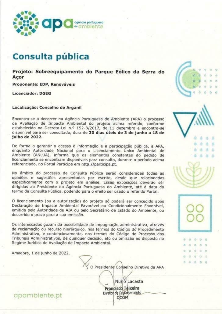 Encontra-se a decorrer o processo de Licenciamento Único de Ambiente do Sobreequipamento do Parque Eólico da Serra do Açõr, o qual é sujeito ao procedimento de Consulta Pública, que decorre até ao próximo dia 18 de julho de 2022.